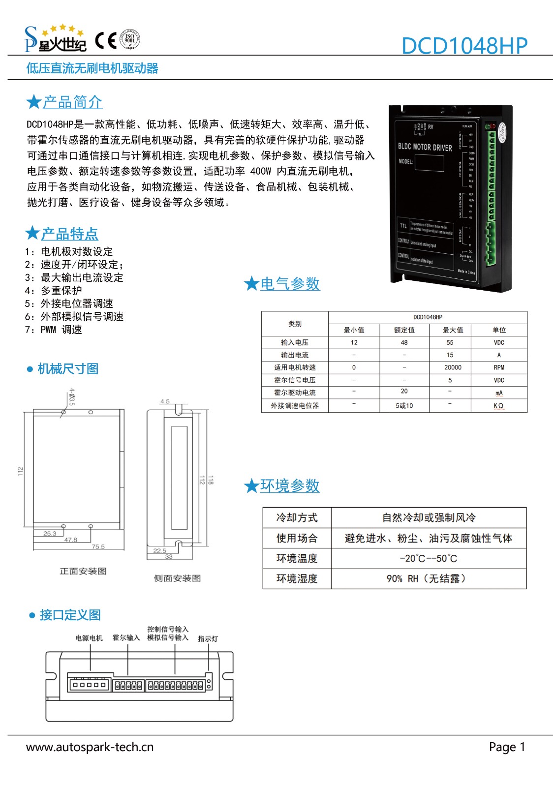 产品简介:DCD400W是一款高性能、低功耗、低噪音、低转速扭矩大、效率高、升温低、带霍尔传感器的直流无刷电机驱动器,具有完善的软硬件保护功能,驱动器可通过串口通信接口与计算器相连,实现电机参数、保护参数、模拟信号输入电压参数、额定转速参数等参数设置,适配功率400W内直流无刷电机,应用于各类自动化设备,如物流搬运、传送设备、食品机械、包装机械、抛光打磨、医疗设备、健身设备等众多领域